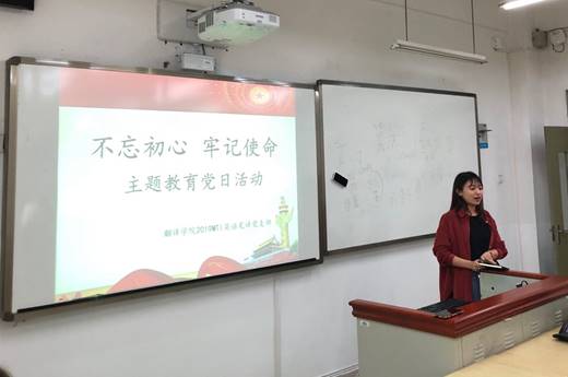 2019 年 9 月 26 日上午, 2019 级 MTI 英语笔译党支部主题党日活动在西区 A 栋教学楼 109 进行。本次活动围绕着“不忘初心、牢记使命”的主题,组织全体笔译党支部同学一起学习了《习近平关于“不忘初心、牢记使命”论述摘编》的理论知识以及相关的会议精神。