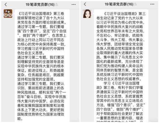2020年10月27日,2019级MTI英语笔译党支部在线开展了10月份党日活动。活动由支部书记刘苏萌同志主持。全体党员深刻学习了《习近平谈治国理政》第三卷的重要内容。