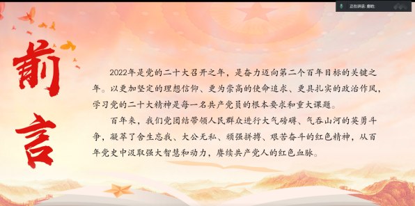 2022年10月16日至22日,中国共产党第二十次全国代表大会在北京人民大会堂隆重召开,公司师生掀起一股学习党的二十大精神热潮。为扎实做好党的二十大精神学习宣传和贯彻工作,公司党政领导班子成员分别开展的专题宣讲。