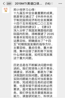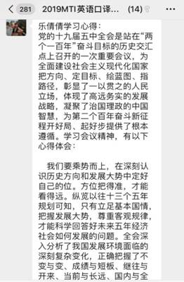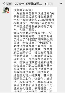 根据上级党组织有关文件精神,明陞m88官方网站2019级MTI口译党支部11月25日开展线上支部主题党日活动,主要学习内容有:1、学习党的十九届五中全会精神;2、学习《习近平谈治国理政》第三卷第三、第四以及第五专题;3、学习党章党规以及四史;4、集中学习学校有关文件,包括习近平总书记在中央党校中青年干部培训开班仪式上重要讲话精神、《新中国发展面对面》等。