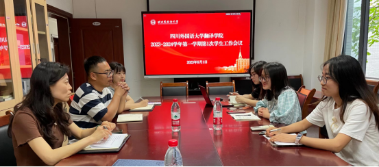 团总支书记张信就新学期学院团学工作重点进行了介绍;本科员工支部书记姚沁以上学期所带年级的读书会以及班级晨读推进激励机制介绍了自己的特色亮点做法;研究生MTI支部书记王品就迎新报道、新生安全教育、新生党员以及党支部教育管理工作进行了交流发言。