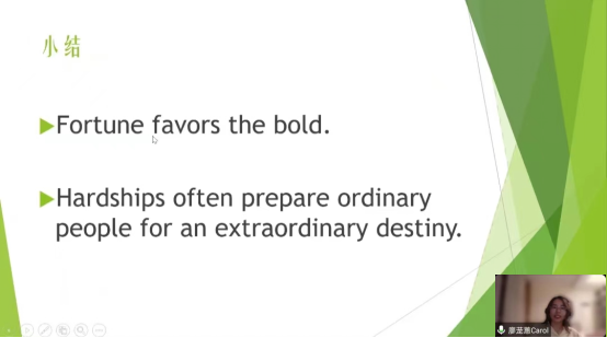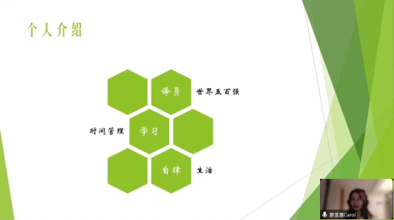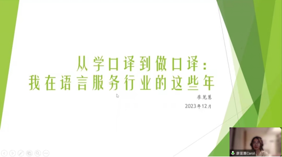为充分发挥优秀员工对在校同学们的榜样引领作用,搭建员工与同学们的沟通桥梁,帮助同学们拓宽视野、树立正确的奋斗目标。12月15日,新一期“翻越山海,‘译’起成长”朋辈学堂系列优秀员工分享会在线上顺利举行。本期我们邀请到学院MTI2021届毕业生廖茏蕙同学,和大家分享她从口译学习到从事口译工作的经历。
