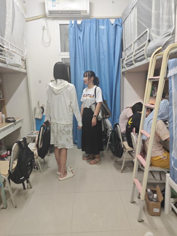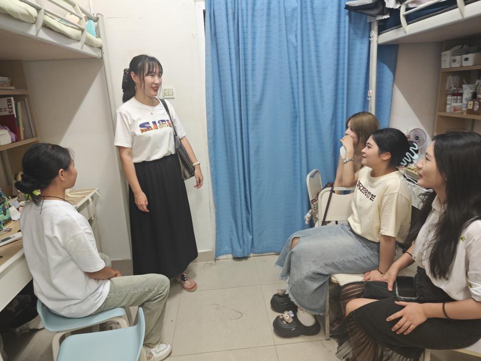 随后,学院学工队伍走访了新生寝室,为同学们送上亲切问候。老师们询问了新生的生活和学习感受,并强调了生活习惯、学业规划、寝室卫生和安全的重要性。学长们则鼓励新同学要建立和谐的寝室关系,积极融入老员工活。