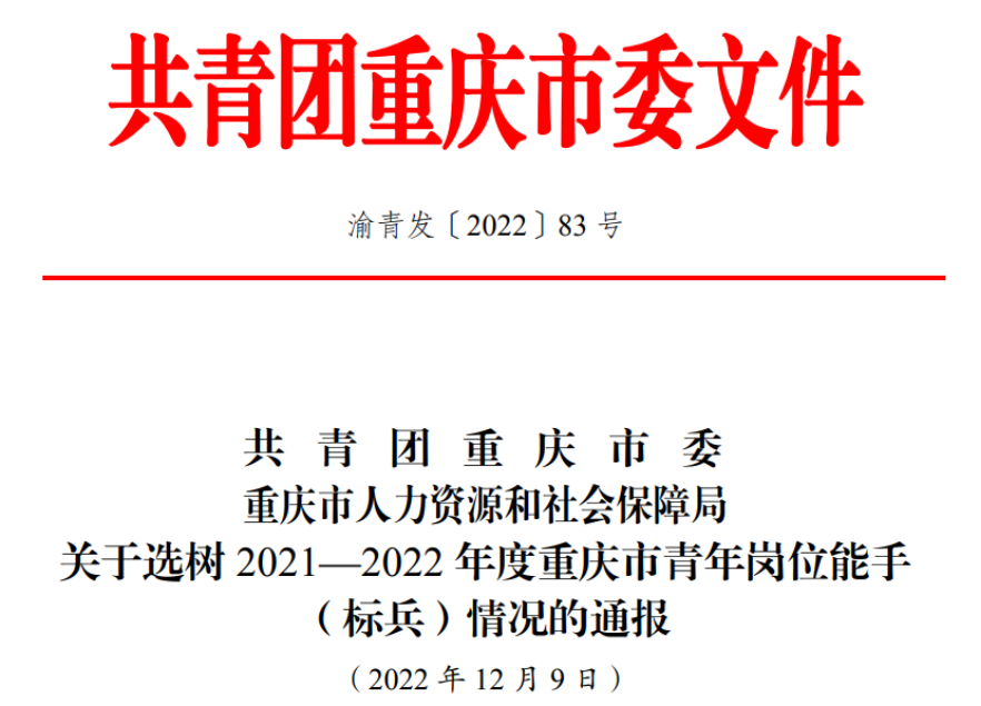近日,共青团重庆市委、重庆市人力资源和社会保障局联合印发《共青团重庆市委重庆市人力资源和社会保障局关于选树2021-2022年度重庆市青年岗位能手(标兵)情况的通报》,经择优遴选、严格把关、集中评审和社会公示,公司教师李希希被授予“2021—2022 年度重庆市青年岗位能手”荣誉称号。