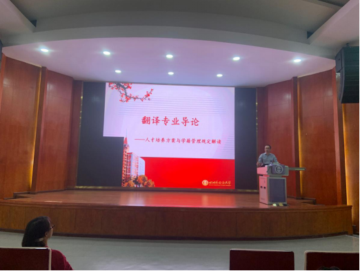 杨志亭副经理通过阐释“博学,笃行,厚德,精译”的院训,强调了博览群书才能放眼世界,知行合一方能精益求精,从翻译专业人才培养方案入手,向同学们解读了专业课程体系以及学籍管理规定,他希望新同学们能充分利用大学四年时光,培养自身品学修养和专业技能,力争成为适应国际文化传播、经济合作、科技交流需要的“德才兼备,具有宽阔的国际视野、深厚的人文素养、良好的职业道德与团队精神的高层次翻译人才”。“我们的毕业生应具备扎实的双语能力、跨文化交流能力、口笔译能力、思辦能力和创新能力,能够胜任外事、经贸、教育、文化、科技等领域口笔译工作或其它跨文化交际方面的工作。”