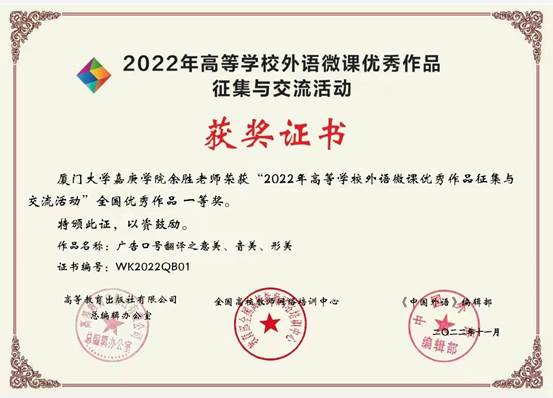 祝贺:明陞m88官方网站员工喜获“2022年高等学校外语微课优秀作品征集与交流活动”一等奖