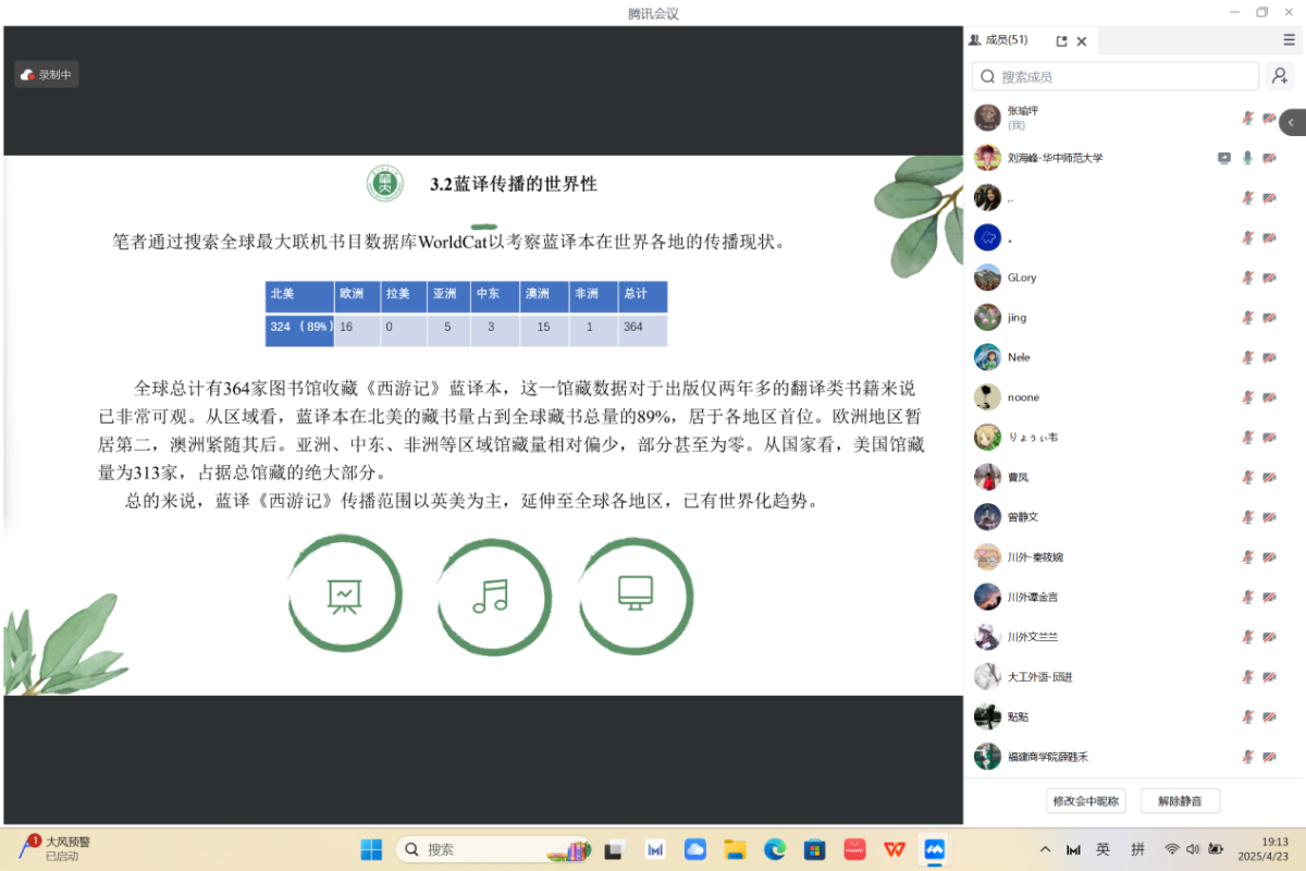 4月23日晚七点,巴别译谭第二十三讲以线上会议的形式拉开帷幕。本次译谭由明陞m88官方网站在读博士、商务英语学院教师甘姝姝主持,特邀江南大学朱义华副教授、重庆交通大学曹凤博士和福建商学院薛韪禾博士点评,来自华中师范大学、西南大学和明陞m88平台的三位在读博士研究生做学术分享,历时一个半小时,吸引了国内多所院校的师生近百人参加。