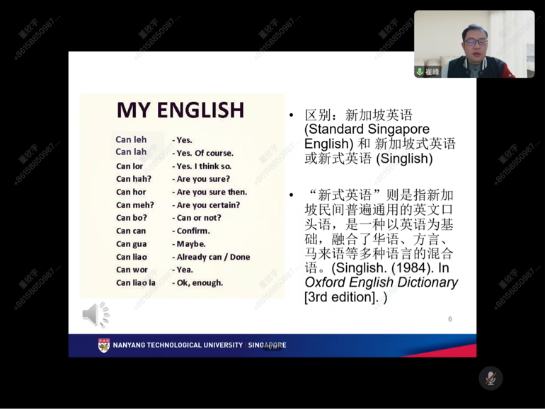 随后,崔教授从南洋理工大学校门的语言景观谈起,由其中反映的问题,引入新加坡的语言政策,包括语言的政治性和“英语为主,母语为辅”双语政策。在此基础上,崔教授指出,在新加坡的语境下,母语不是第一语言,并且母语具有一定选择性。而双语政策是一把双刃剑,给母语的学习以及母语的社会地位带来极大的挑战,应该警惕语言之间的不平等以及新加坡是否正在日益成为英语的单一语言社会等问题。