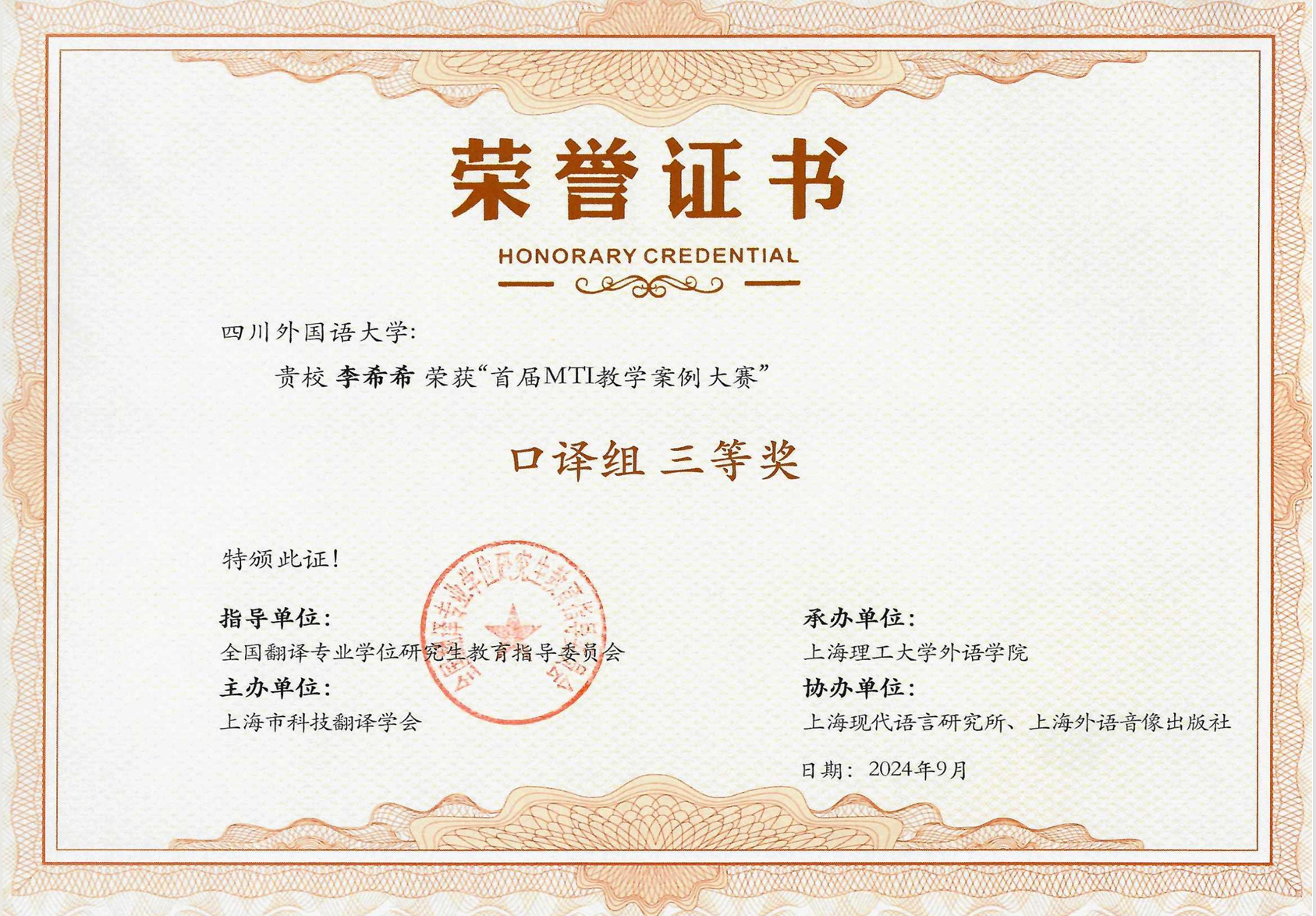 公司杨志亭老师领衔的师生团队(杨志亭、徐汉杰、李圆圆、王彦心、张家红、罗鸿春)提交的参赛作品“讲好重庆能源故事 助塑中国科技形象——以《提升能源供给含‘绿’量》文本翻译为例”获笔译组三等奖。李希希老师的作品“科技赋能•向世界传译中国——《交替传译》教学案例”获口译组三等奖。