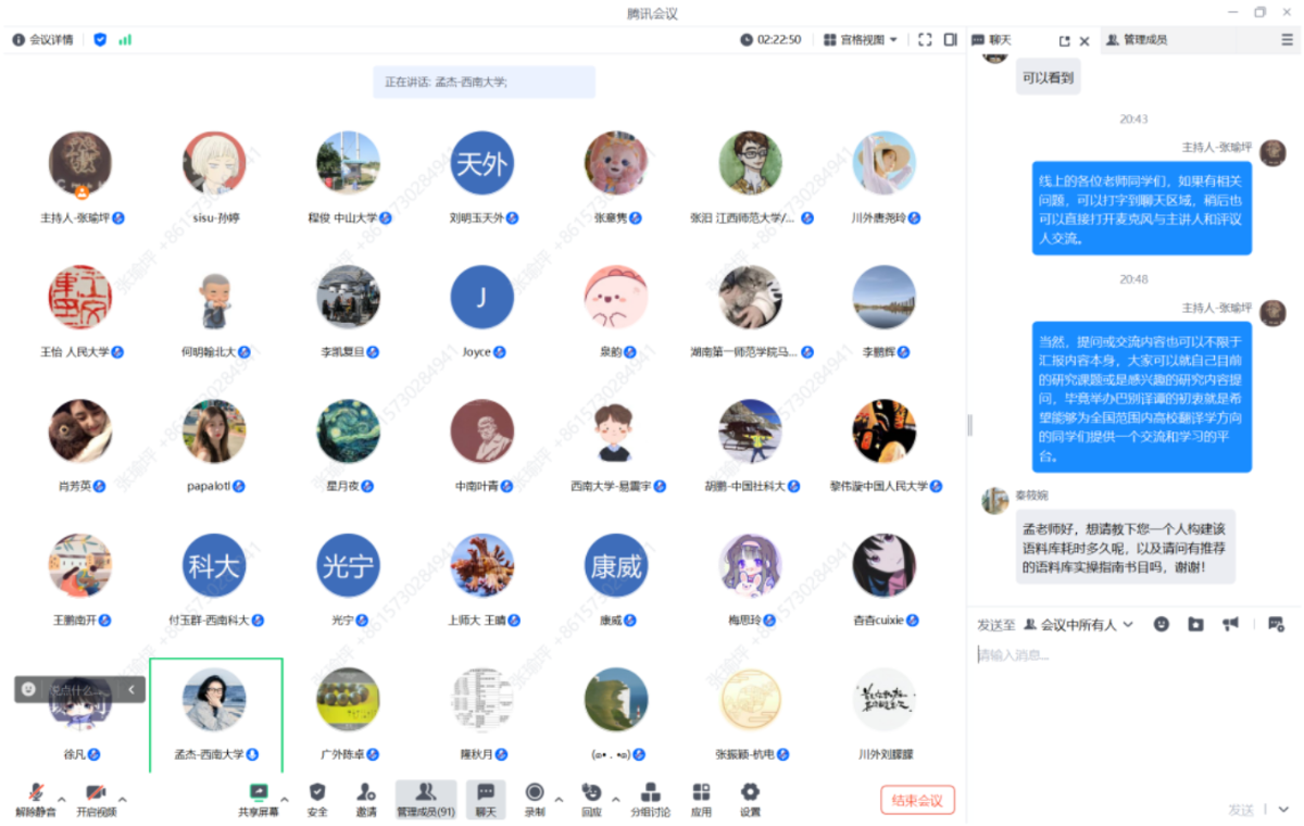 三位同学的精彩汇报后,张汨老师与李鹏辉老师基于自身多年的学术积累,针对性地提出了建设性意见,线上师生也积极踊跃地就自身感兴趣的领域或困惑与三位主讲人进行深入的学术交流。本次译谭虽仅历时两个小时,但主讲人的创新思想、师生的学术传承精神将会在新生代学者间历久弥新、薪火相传。