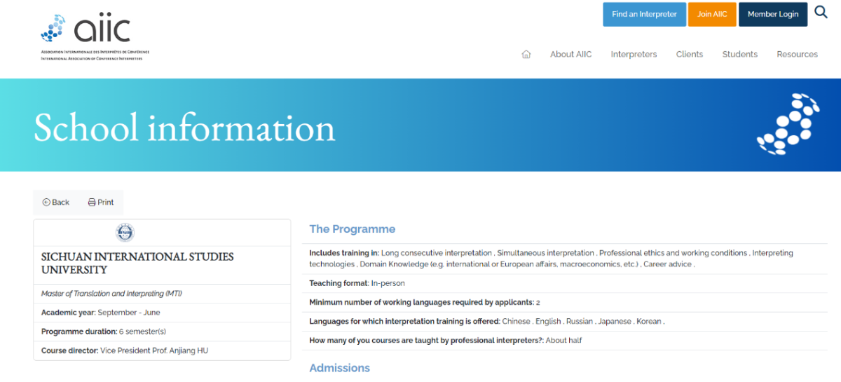 为促进口译教学最佳实践,帮助立志从事口译的员工选择高质量的院校,AIIC发布了口译教学实施标准,涵盖入学遴选、课程设置、教学形式、团队配备等7大维度,并在此基础上推出了院校名录,只有满足标准的学校和专业课程才能被收录。公司的翻译硕士(MTI)专业经AIIC评估,成功入选,这代表公司的口译教学水平得到了AIIC的认可,符合其所制定的国际会议口译教育标准。同时入选院校名录的还有美国明德大学蒙特雷国际研究学院、瑞士日内瓦大学、英国巴斯大学、广东外语外贸大学等院校。