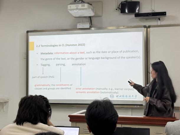 科学技术日新月异,语言学研究面临前所未有的机遇与挑战。语料库成为了现代语言学研究中不可或缺的工具,而语料库语言学的出现则拓展与丰富了语言学研究的视角与方法。叶军学姐以简洁明了的语言和生动的实例,为在场的听众揭开了语料库及语料库语言学的神秘面纱。她解释道,语料库是一系列精选的、电子化存储的文本或话语样本,专为语言研究而准备;而语料库语言学则是通过收集和分析大量真实语言材料(即语料库)来探究语言现象的科学。