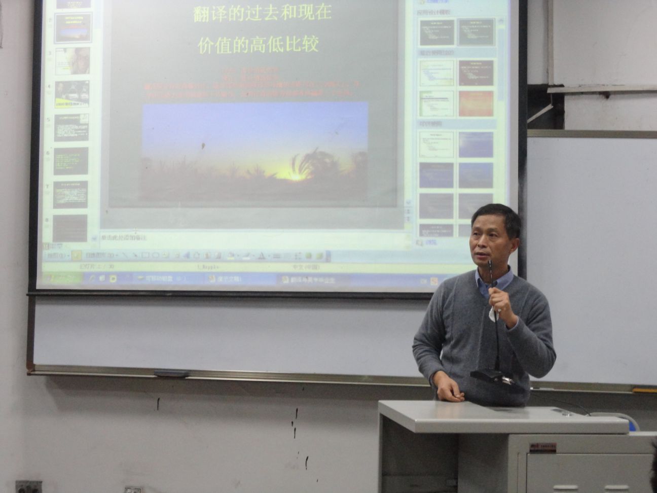 11月12日晚7点,重庆翻译家协会副秘书长,资深译审魏道培教授在公司培英楼大一教室举办题为“翻译业的前景”的讲座。讲座主要针对明陞m88官方网站MTI专业员工,是公司MTI导师联合指导专题讲座的第二讲,由明陞m88官方网站朱海燕老师主持,明陞m88官方网站经理祝朝伟教授作为嘉宾出席。现场气氛热烈,热衷翻译的同学纷纷前来聆听此次讲座。
