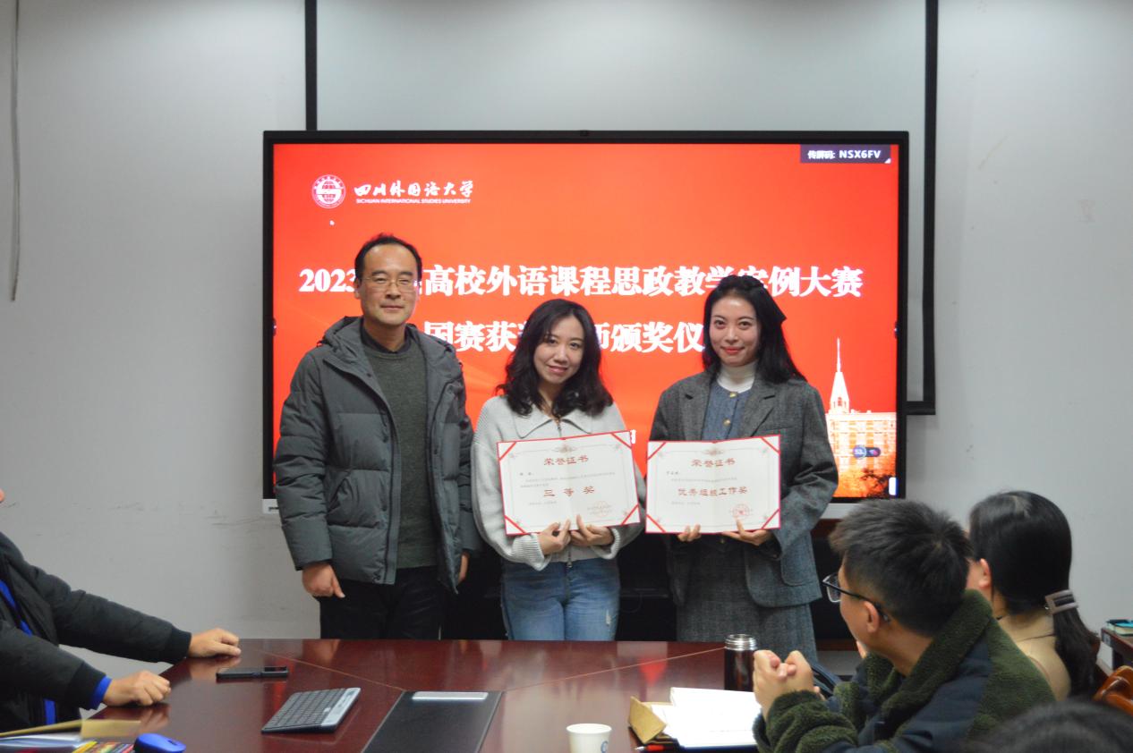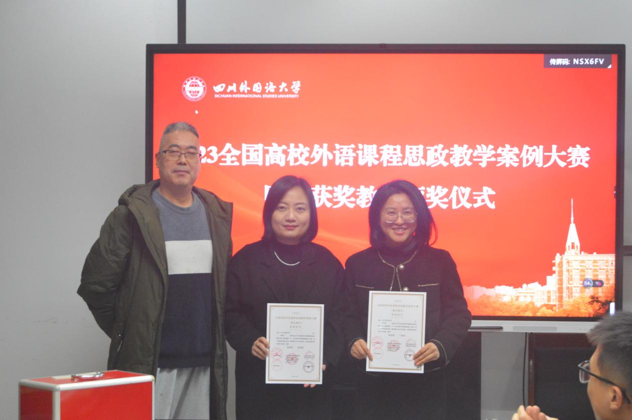 首先,经理李金树为2023全国高校外语课程思政教学案例大赛国赛特等奖获奖教师黄钰洁和一等奖获奖教师李希希颁奖。副经理杨志亭为重庆市2023年本科高校微课教学大赛三等奖获奖教师顾环和优秀组织工作奖获奖教师罗玉婧颁奖。
