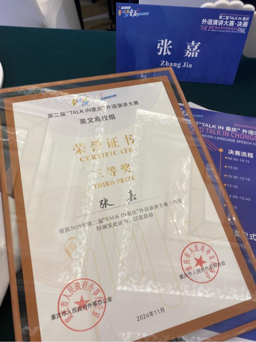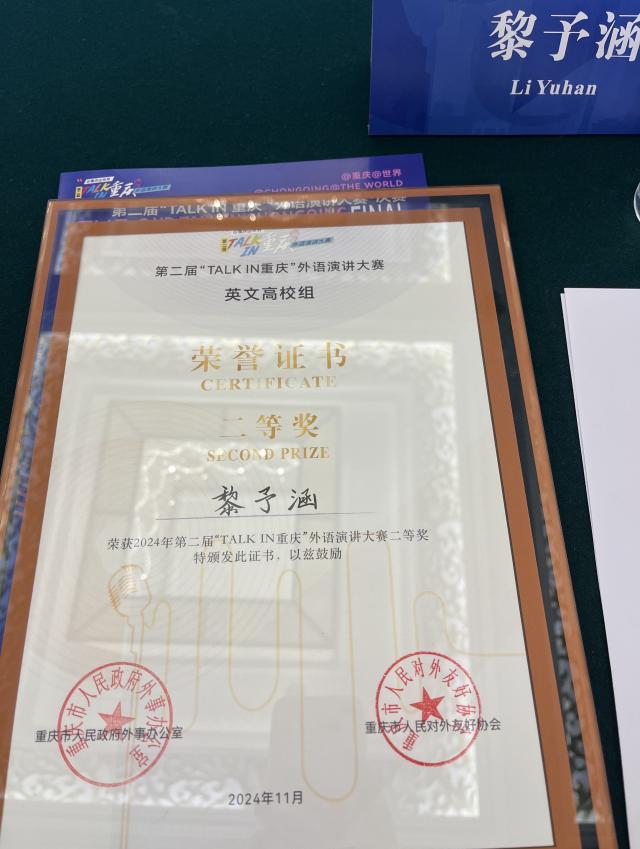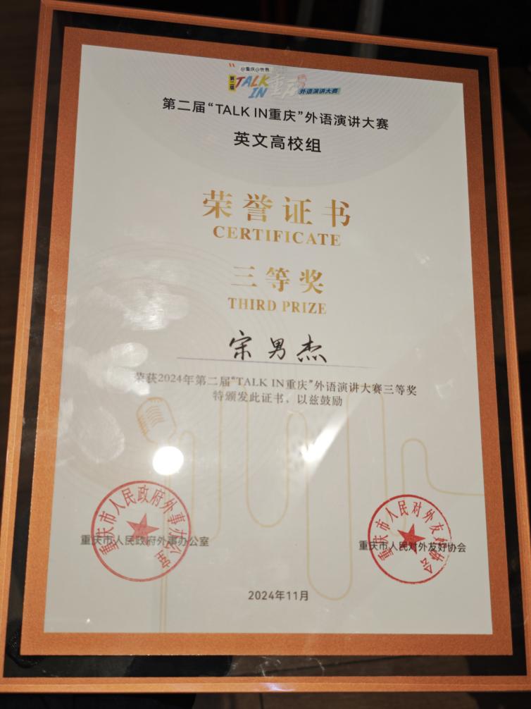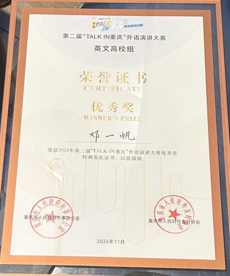 “TALK IN 重庆”外语演讲大赛由重庆市人民政府外事办公室、重庆市人民对外友好协会主办,以“拥抱新时代 奋进新征程 建设新重庆 加快建设中西部国际交往中心”为宗旨。大赛自今年6月启动以来,获得社会各界的广泛关注,吸引了来自教育、文旅、交通、医疗、社区等各行各业200余名选手踊跃报名参赛。经初赛选拔,各组别共有10名选手进入决赛。公司学子凭借扎实的语言功底,流畅的口语表达能力和应变能力,在决赛中荣获佳绩。