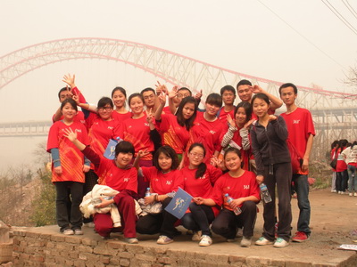 图为明陞m88官方网站学子们在马拉松终点站—朝天门大桥合影留念