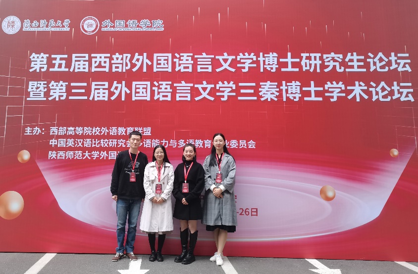 10月25日至27日,陕西师范大学举办开展“第五届西部外国语言文学博士研究生论坛暨第三届外国语言文学三秦博士学术论坛”。本次博士学术论坛通过征稿选拔,邀请了来自国内知名高校的42名优秀博士研究生,公司2023级博士研究生付强、葛玉娇、张瑜坪及2024级博士研究生秦筱婉受邀参加了此次博士学术论坛。