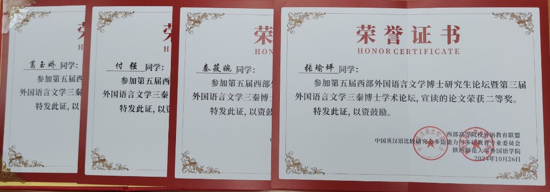 设置了外国文学研究、语言学研究、翻译与翻译学研究以及文化与文化对比研究四个分论坛。公司4名学子均表示,通过本次论坛交流,对外国文学、语言学、翻译以及文化对比研究都有了更全面的认识。这些领域不仅相互关联,还共同构成了跨学科理解和交流的基础。希望未来能在这些领域继续深入探索,促进更广泛的学术交流与合作。此外,在论文评奖环节,葛玉娇与张瑜坪荣获二等奖,付强荣获三等奖,秦筱婉荣获优秀奖。