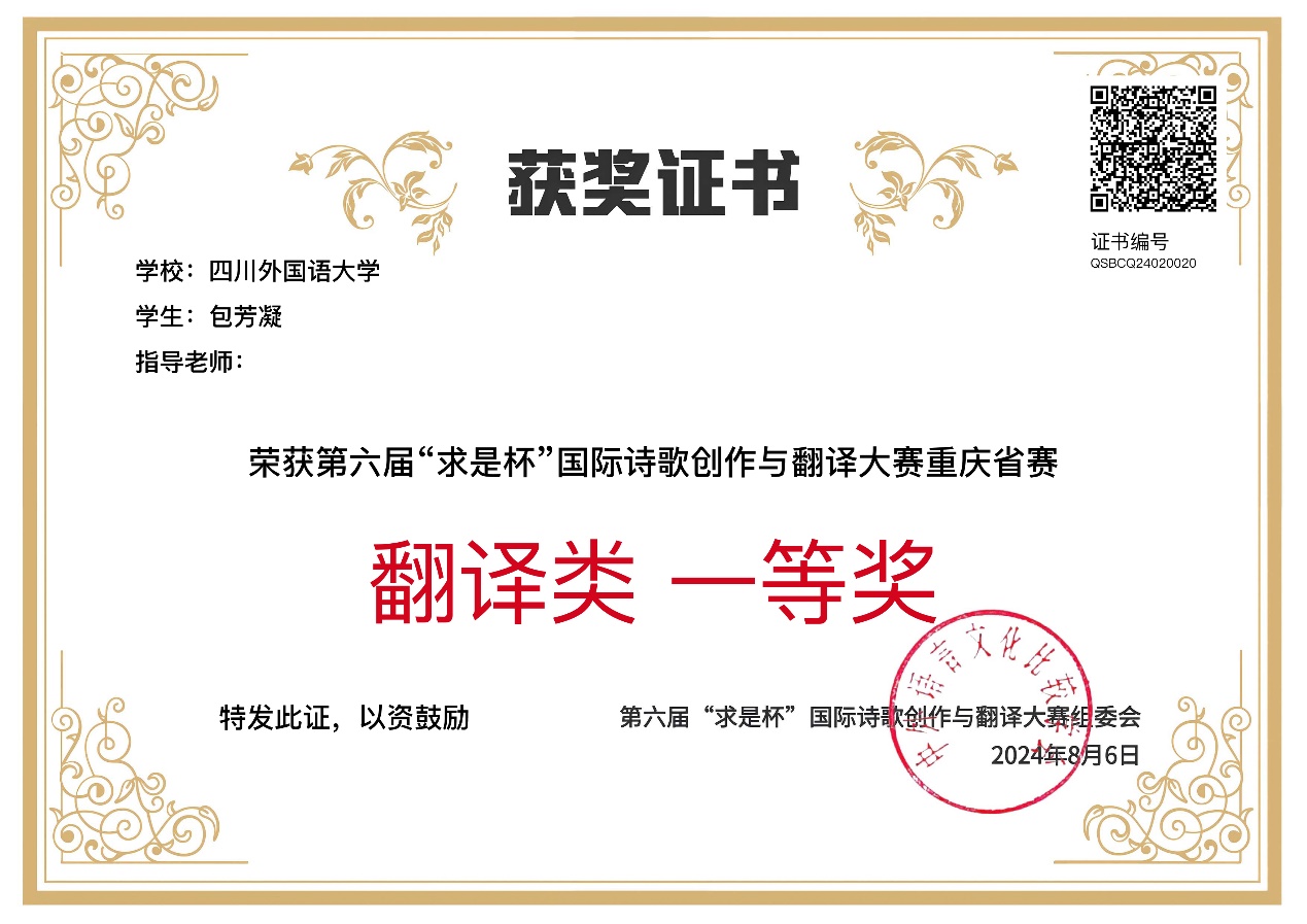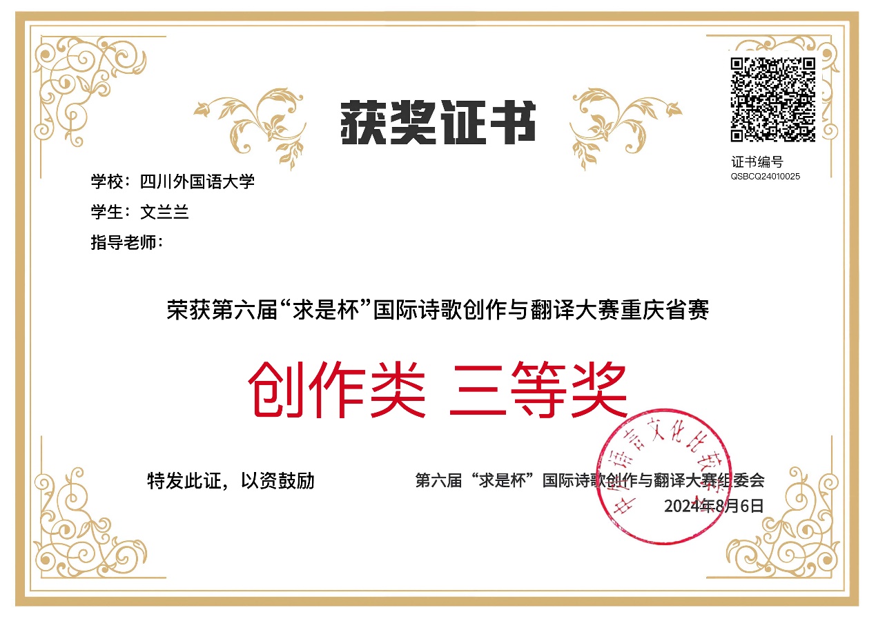 2024年7月25日,第六届“求是杯”国际诗歌创作与翻译大赛省赛评审结果公布。公司员工在比赛中表现突出,喜获佳绩。2023级研究生包芳凝获得重庆市赛翻译类一等奖,2023级研究生文兰兰、2022级本科生王亚熙获得重庆省赛创作类三等奖。