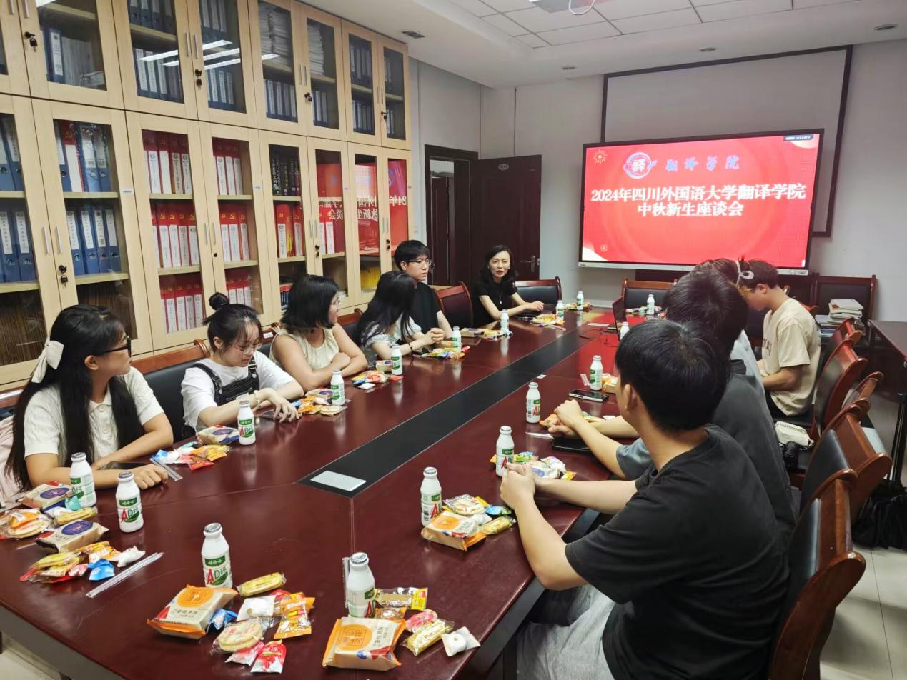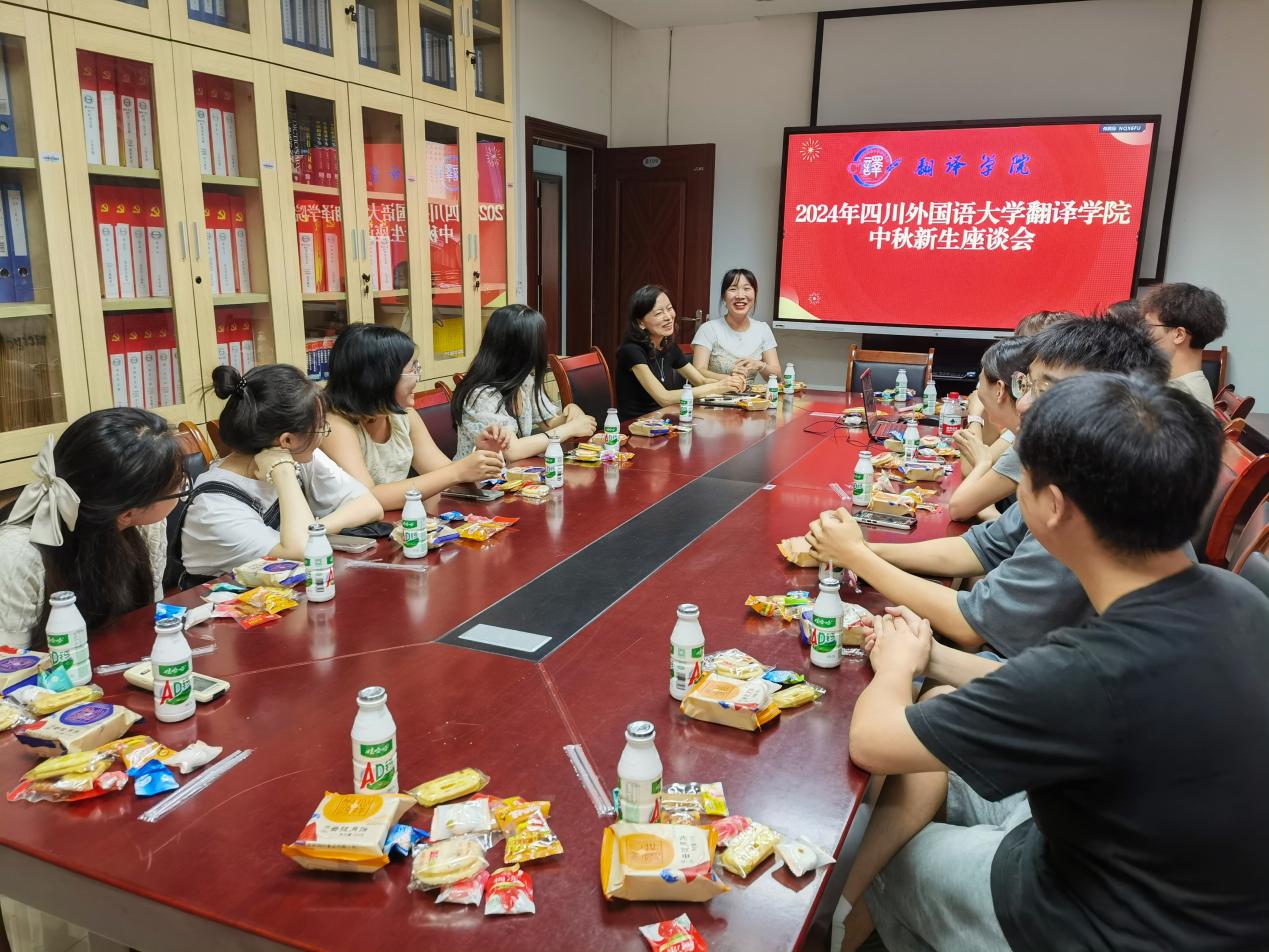 座谈会上,学院为同学们精心准备了月饼以和食品,现场充满了节日的氛围。张丽老师为同学们送上了亲切的慰问和节日的祝福,并介绍了学院的总体情况,鼓励大家积极参加翻译专业相关的比赛和实践活动,真正做到“学以致用”,做新时代的复合型人才。刘弈扬老师结合自身经历,向大家介绍了学院的员工工作理念;刘朦朦老师细心周到为新同学们答疑解惑,分享自己在学习、生活中的心得体会。座谈会上,新同学们逐一介绍了自己的求学经历;细述离开家乡,初到川外、初到学院的感受;分享适应新环境、结识新朋友中的趣事;描绘自己对接下来学习生活的期待以及对未来的目标和蓝图。师生交流轻松热烈,现场氛围温馨融洽。