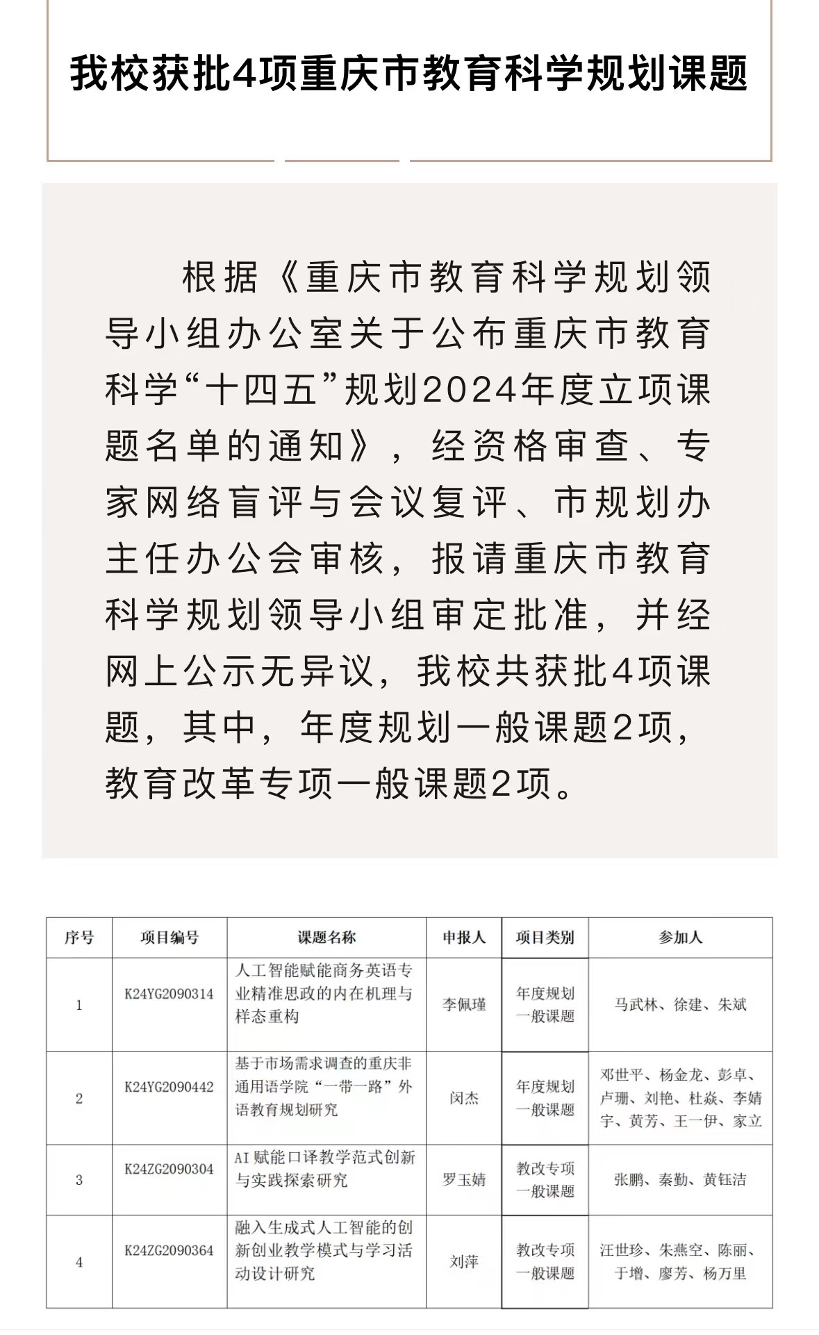 近日,接重庆市教育科学规划领导小组办公室通知,公司罗玉婧老师及其课题团队申报的《AI赋能口译教学范式创新与实践探索研究》成功获批重庆市教育科学“十四五”规划2024年度课题立项。