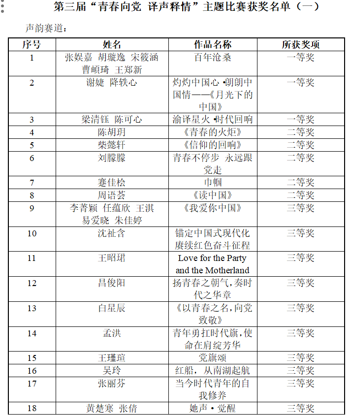 此次大赛的开展为青年学子搭建了绽放理想、淬炼信念的广阔舞台,生动诠释了新时代青年与党同心、跟党奋斗的赤诚情怀。从声韵赛道的慷慨激昂到微团课赛道的创新演绎,从经典诵读的薪火相传到理论宣讲的青春表达,参赛选手们以多元形式谱写时代华章。青春孕育无限希望,青年创造美好明天。大赛虽已落幕,但青春向党的脚步永不停歇!