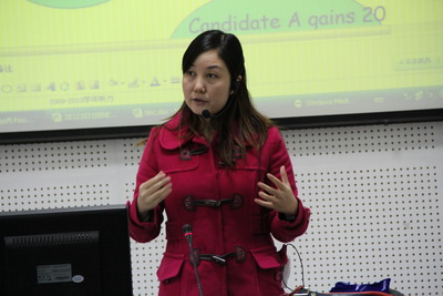 本次的课堂观摩课为朱雪莲老师的高级听力课程。课堂伊始,朱雪莲老师就以别开生面的方式开始这堂课:她用地图直观生动地向同学们讲解了此次新闻听力材料的背景知识,然后朱老师放了一段慢速VOA新闻听力,让同学们分别用英文和中文复述,以此达到训练员工短时记忆的目的。紧接着朱雪莲老师通过一段美国大选新闻听力练习向同学们展示新闻听力的几点关键要素。最后,朱老师结合教材,用一篇题为“Function of Language ”的听力材料来训练同学们的gap filling技能,并阐述了逻辑,意群,平行结构等在英语听力中的重要作用。在整个教学过程中,朱雪莲老师幽默风趣,思路清晰,整个课堂气氛活跃,张弛有度。员工们不仅锻炼了听力,学习了听力技巧,还拓展了视野。