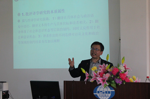 2014年4月15日,上海交通大学外国语学院常务副经理胡开宝教授应邀在博文楼6楼报告厅做了一场题为“批评译学研究:内涵与方法”的学术讲座。此次讲座由明陞m88官方网站经理祝朝伟教授主持,廖巧云教授、姜孟教授、李金树书记以及各年级研究生参加了本次讲座。