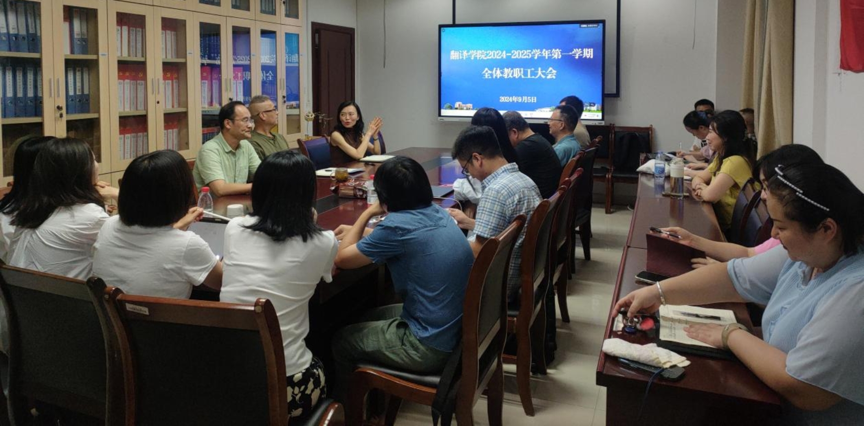 最后,经理李金树教授从健康意识、岗位意识、实践意识和技术意识四个方面出发,贯穿梳理新学期的各项工作。他提出,新学期,一要增强健康意识,践行健康工作方式和生活方式,做自我健康第一责任人;二要强化岗位意识,明确责任所在,保持对公司产品工作的热情和内驱力,以不愧教师这一职业和身份;三要践行实践意识,在强化翻译实践的基础上,深入行业公司,参加和专业相关的讲座、论坛和研讨会,用“刀在石上磨,人在事上练”的精神,在实践、实战中自我提升和培养翻译人才;四要更新技术意识。面对人工智能的普及,翻译专业的从业者要加强危机意识和责任担当,在守正创新中驱动翻译人才培养质量跃升。