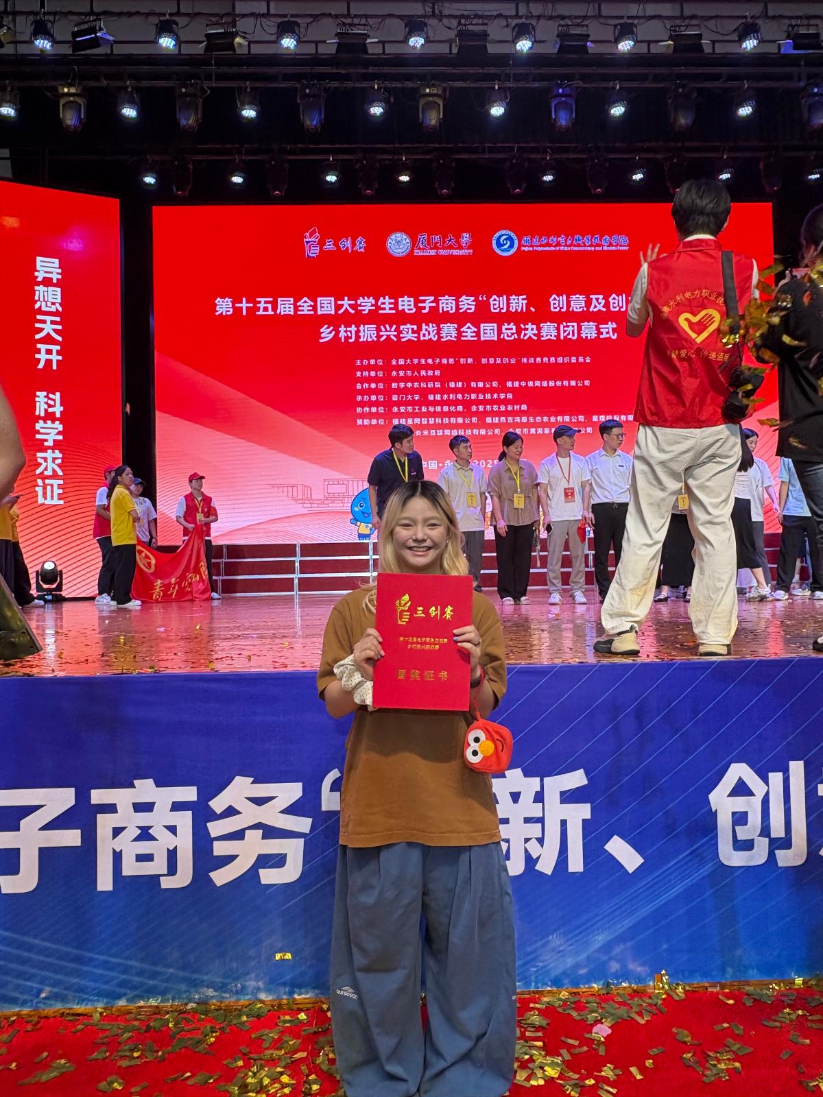 2025年7月17日,第十五届全国老员工电子商务“创新、创意及创业”挑战赛(以下简称“三创赛”)乡村振兴实战赛全国总决赛落下帷幕,公司23级本科生王馨悦所在的Carpediem小队,凭借扎实的项目落地能力与鲜明的创意亮点,成功摘得全国一等奖!