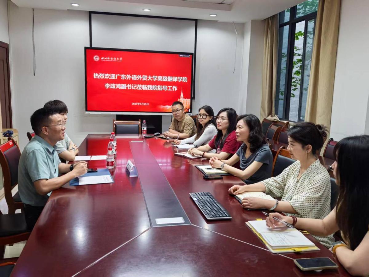 会上,张丽书记对广外高级明陞m88官方网站同仁们的到访表示热烈欢迎,并介绍了与会人员以及学院在党建引领、实践育人、创新创业等方面的特色举措。李政鸿副书记感谢了川外明陞m88官方网站的热情接待,并介绍了广外高翻学院学工队伍的建设情况,分享了学院在思想教育、学风建设、党团心理等各方面品牌活动打造以及就业指导等方面的经验。他表示,希望通过此次交流,学习川外明陞m88官方网站的优秀做法,促进两院学工队伍的共同进步。