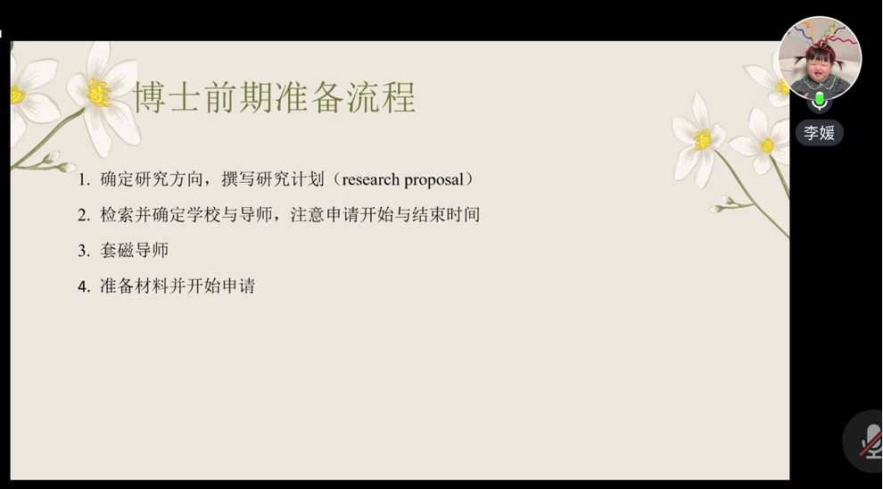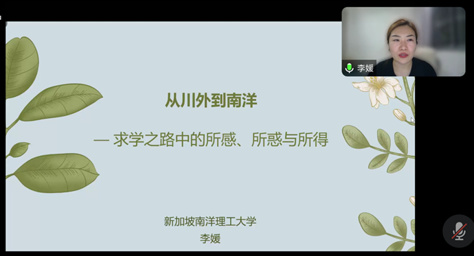 李媛员工目前是新加坡南洋理工大学的在读博士生,主要从事中国政府白皮书英译研究。本次分享主题为“从川外到南洋——求学之路中的所感、所惑与所得”,分为读研回顾、博士申请和问答三个环节。她首先回顾了三年的研究生生活,“政府实习”和“学术研究”是这段生活的关键词。李媛着重提到研一假期在重庆两江新区管委会实习的经历,认为这段经历为她未来的研究方向做了铺垫。随后,她从专业确定、备考经验、复试经验三个方面为大家分享了博士申请阶段具体细节,“要针对目标院校的要求进行有策略的准备,包括语言要求、学位证、成绩单、推荐信、简历等”。学校的层次可以从平台、就业前景和学术氛围这三个方面来选择自己心仪的大学。
