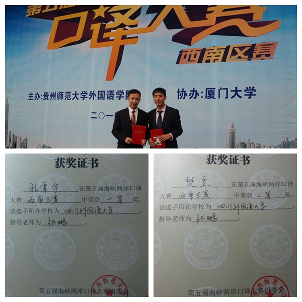 5月11日,第五届海峡两岸口译大赛西南区级赛在贵州师范大学圆满落下帷幕。本次口译大赛西南区决赛共有52名参赛选手入围,分别来自四川、重庆、云南、贵州和西藏五个省(市、区)的27所高校。公司2012级本科生程霄宇和2013级MTI研究生樊皇代表学校参加了此次大赛。两位同学不负众望,从52名选手中脱颖而出,取得了优异成绩。其中,程霄宇同学以总分第一的好成绩获得一等奖;樊皇同学也凭借出色的发挥,以总分第四的好成绩获得二等奖,为公司争得荣誉。