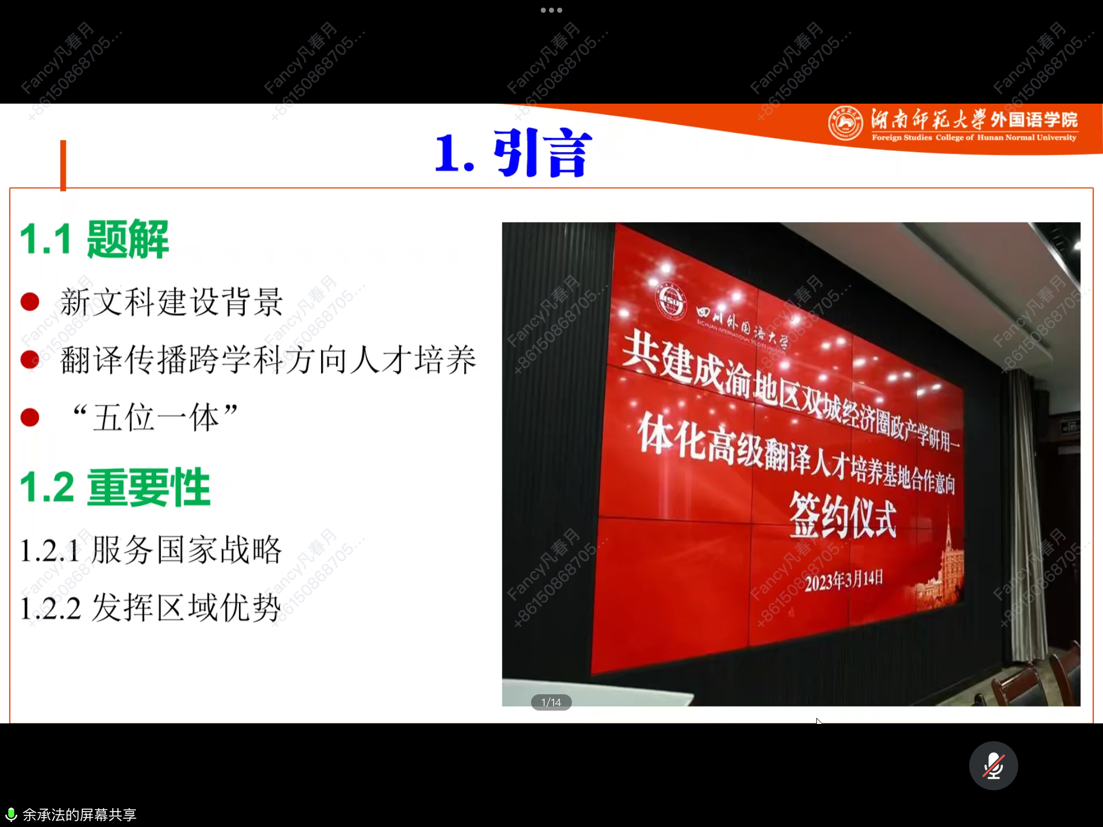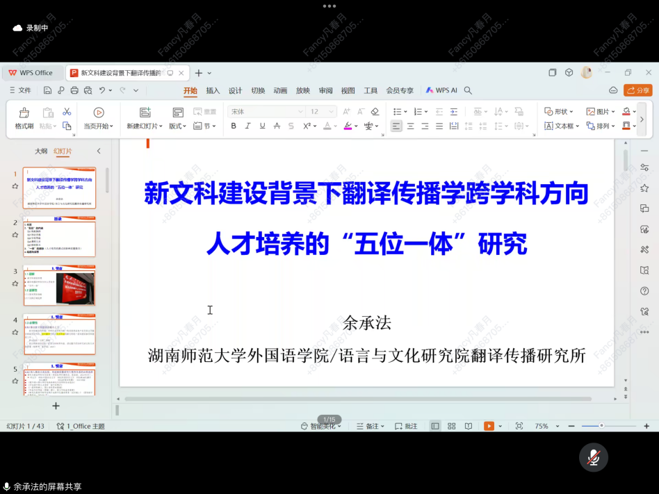 5月14日晚七点,湖南师范大学“潇湘学者”特聘教授余承法教授为公司师生做了题为“新文科建设背景下翻译传播跨学科人才培养的‘五位一体’研究”的学术讲座。讲座由公司张文鹤副教授主持。