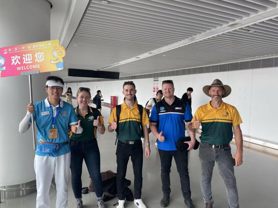 汤鹏同学在机场廊桥接待处志愿服务点与澳大利亚籍裁判和选手合影