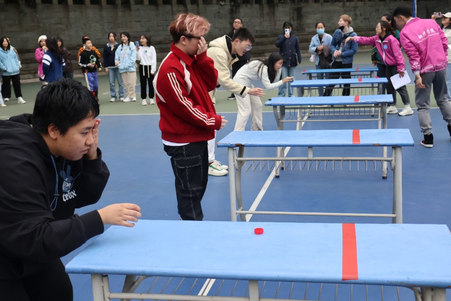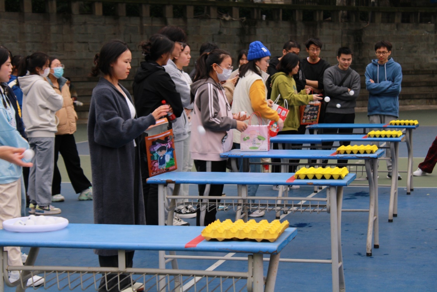 个人赛分为抢扫把、旋转不倒翁、疯狂水滴、弹跳乒乓球四个项目。 “项目是我没有想到的,比想象中的还要难一些。”参加疯狂水滴项目的2023级研究生冯志杰赛后说道。