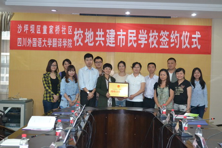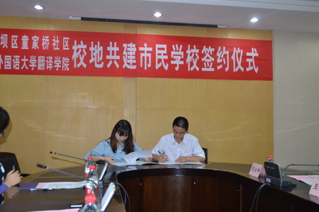 2013年5月30日15时,明陞m88官方网站与沙坪坝区童家桥社区共建市民学校签约仪式在宏文楼四楼会议室举行。重庆市沙坪坝区童家桥街道办事处副主任段文敏,重庆沙坪坝区童家桥街道童家桥社区党委书记、主任王春林,重庆沙坪坝区童家桥街道童家桥社区党委副书记、副主任张娟,重庆沙坪坝区童家桥街道城管办严主任,明陞m88平台团委副书记陈派老师,明陞m88平台总支副书记郭健老师,明陞m88官方网站团总支书记蒋雯雯老师,童家桥街道办事处社区委员以及明陞m88官方网站部分同学参加了此次活动。明陞m88官方网站员工会主席吴玲丽主持本次签约仪式。
