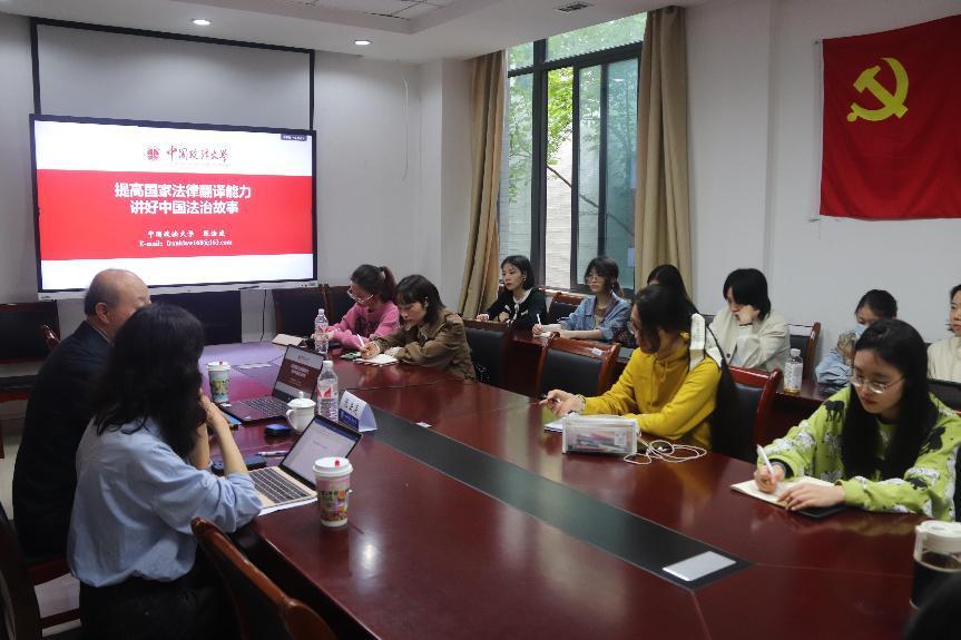 2024年4月22日下午,中国政法大学博士生导师张法连教授应邀莅临学院,为公司师生作了题为 “提高国家法律翻译能力,讲好中国法治故事” 的学术讲座。讲座由学院总支书记张丽主持,学院中青年教师、硕士生和本科生代表30余人参加。