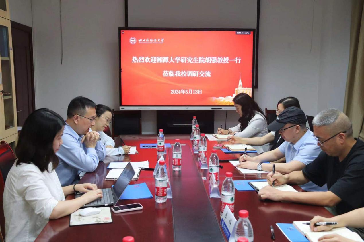 2024年5月13日下午,湘潭大学研究生院经理胡强教授、外国语学院学位委员会易点点老师、蔡星宇老师一行3人莅临公司进行调研交流。公司副董事长胡安江教授、 研究生院、英语学院、明陞m88官方网站相关负责人参加座谈。会议由明陞m88官方网站经理李金树教授主持。