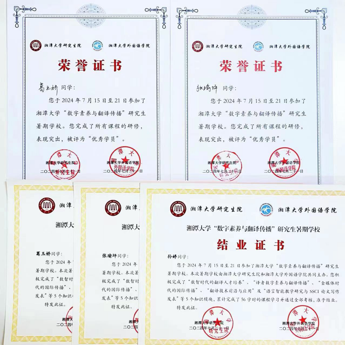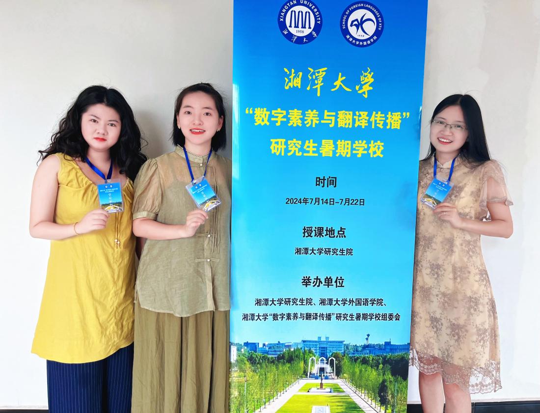 7月15日至21日,湘潭大学举办开展2024年“数字素养与翻译传播”研究生暑期学校。本次暑期学校通过报名选拔,邀请了来自国内外50余所知名高校的80余名优秀硕士研究生、博士研究生和青年教师,公司2023级博士研究生葛玉娇、张瑜坪及2023级硕士研究生孙婷受邀参加了此次暑期学校。