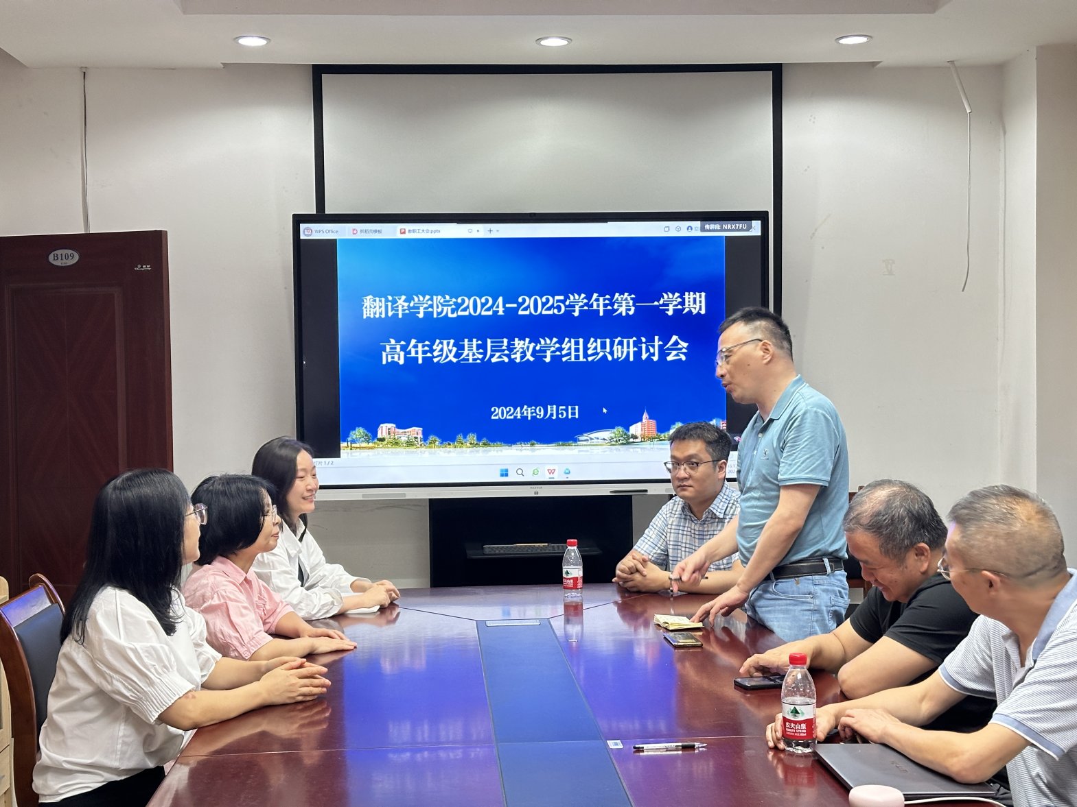 李海峰就本学期整体安排、月度教研主题活动、课程建设、八级培训和模拟、教学实践周活动主题征集等作了相关部署。之后与会老师围绕本学期《高级英语》、《英语高级写作》、《学术论文写作》、《英美国家文学概论》等课程的教学进行了研讨。会议决定拟将《英语高级写作》打造成校级思政课程,承担该门课程的朱海燕和但凝洁两位老师就课程建设的思政元素、课程设计、教学改革等提出了设想。会议还决定本学期大力推进“中华学术外译项目”的申请,力争在项目上再次有所突破。
