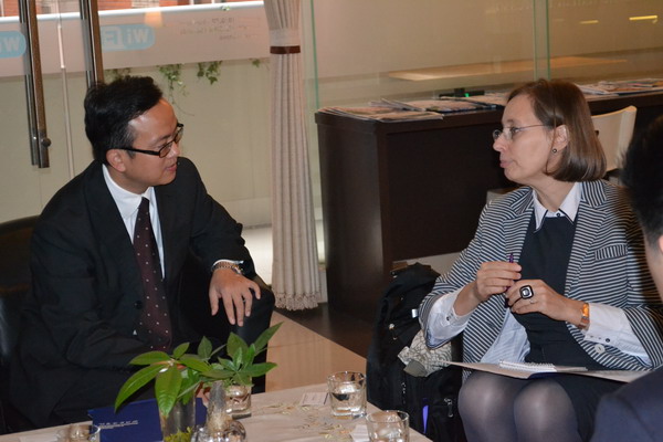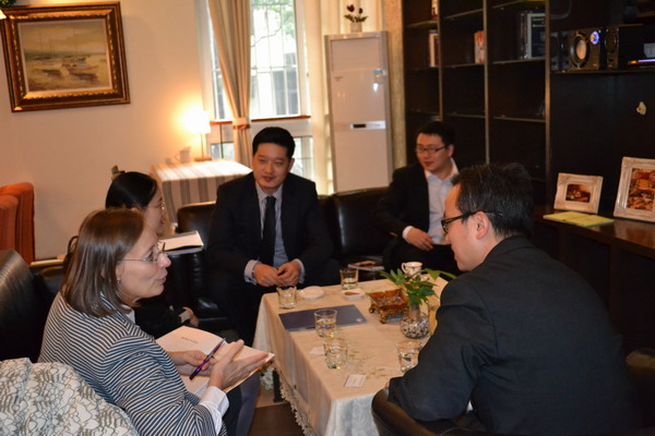 近日,应公司外事处和明陞m88官方网站的邀请,英国伦敦城市大学口译专业学科带头人Danielle D’Hayer教授于11月3日—4日来公司交流访问。11月3日上午,明陞m88官方网站经理祝朝伟、副经理张鹏就翻译专业团队队伍、课程设置、培养计划、员工专业素质与就业等方面与Danielle教授进行了深入的交流。随后,祝朝伟、张鹏陪同Danielle观摩了公司李芳琴教授的口译授课。Danielle不仅对公司先进、专业的口译实验室设备表示认可,更对灵活生动的口译课堂教学方式和员工良好的专业素质大加赞赏。Danielle表示,对未来伦敦城市大学与四川外语学院国际化合作办学的前景充满信心。