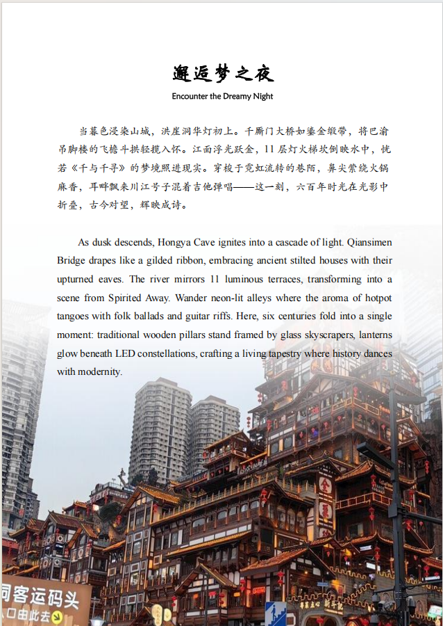 2022级各班参赛选手在班导师指导下,以“8D魔幻交通”“洪崖洞时空叠影”“舌尖上的火辣重庆”“穿越洪崖洞之夜”“重庆名片”“万州烤鱼”等为主题,以多元视角展示了山城之“魂”。这些作品或以历史之眼感知磁器口的悠悠古韵与巴渝情浓,或以实用攻略织就九宫格游玩动线、或以色香味叙事唤起地方美食的麻辣鲜香、或以符号解构呈现网红地标与立体交通交织的魔幻意象。
