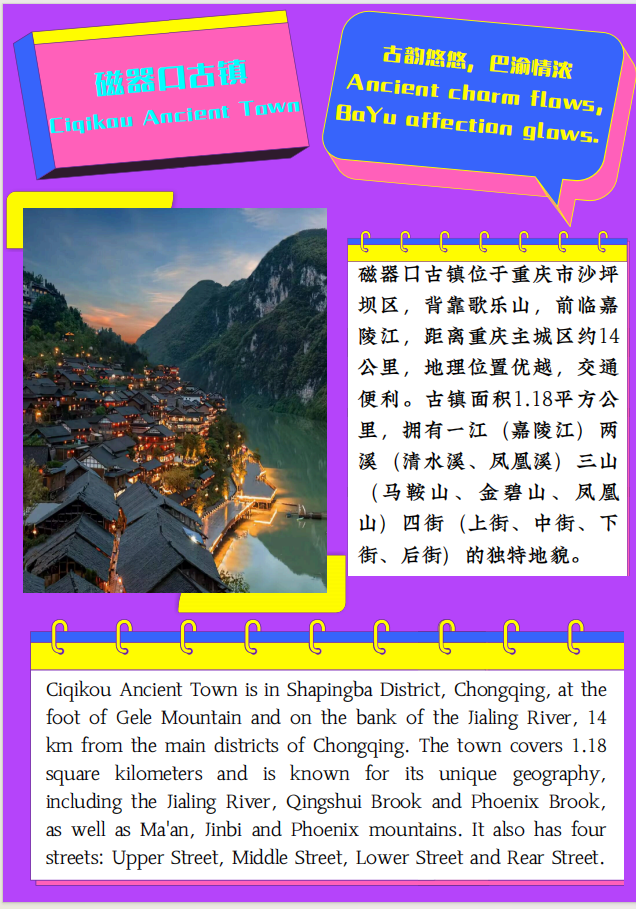 为引导员工深入挖掘重庆文旅资源与非遗文化的核心价值及独特魅力,提升跨文化内容策划、文案与视觉创作以及精准传播能力,产出具有实际应用潜力的双语传播作品,服务重庆文旅国际推广,并强化团队协作、项目管理与沟通展示等综合素养,本学期本科高年级综合教研室在实践周期间举行了“重庆名片”双语宣传册设计工作坊活动。