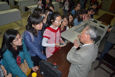 讲座一开始,谭教授就引导同学们设想了一个没有翻译的世界,他引用了国际译联主席贝蒂科恩的一段讲话,点明了翻译的重要性。接着,谭教授从社会需要和国家发展等方面清晰地概括了翻译的七大功能。同时,他还指出当下中国存在很多中式翻译的现象,通过举出各地对“休息室”这一名词的各种奇怪译法来进行阐释,博得同学们阵阵掌声。鉴于翻译工作的重要性以及翻译人才的稀缺性,谭教授指出,优秀的口笔译工作者不仅要有扎实的中外文基本功,清晰、流畅而准确的语言表达能力,还要有良好的记忆能力、反应能力和逻辑思维能力。因此,对于英语、翻译等外语专业的员工来说,要积生活点滴之功,注重自身语言能力和综合素质的提高。他希望同学们要努力学好各门课程,广泛涉猎各领域的知识,纯正自己的语音和语调,学习中要勤模仿、多积累、多实践。在讲到发音问题时,谭教授为同学们亲自示范了一些单词的读法,以帮助同学们更好地掌握各种发音的正确习惯。讲座结束后,谭教授真诚地表达了对同学们的美好祝愿,希望同学们今后都能拥有一段光明的未来和锦绣的前程。