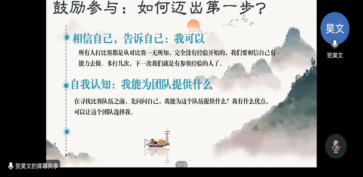 首先,贺昊文同学与大家分享了自身经历和参与本次比赛的心得体会。确定参赛后,她客服了时间紧等各种困难,自己组建了团队,一边学习一边积累经验,最终收获了优异成绩。她以这段经历激励在场同学,“勇于尝试”至关重要,哪怕是毫无经验的“新手小白”,也别畏惧迈出第一步,就有可能推开成功的大门。