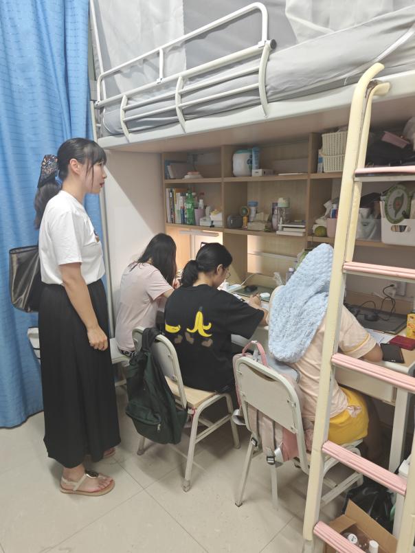 随后,学院学工队伍走访了新生寝室,为同学们送上亲切问候。老师们询问了新生的生活和学习感受,并强调了生活习惯、学业规划、寝室卫生和安全的重要性。学长们则鼓励新同学要建立和谐的寝室关系,积极融入老员工活。