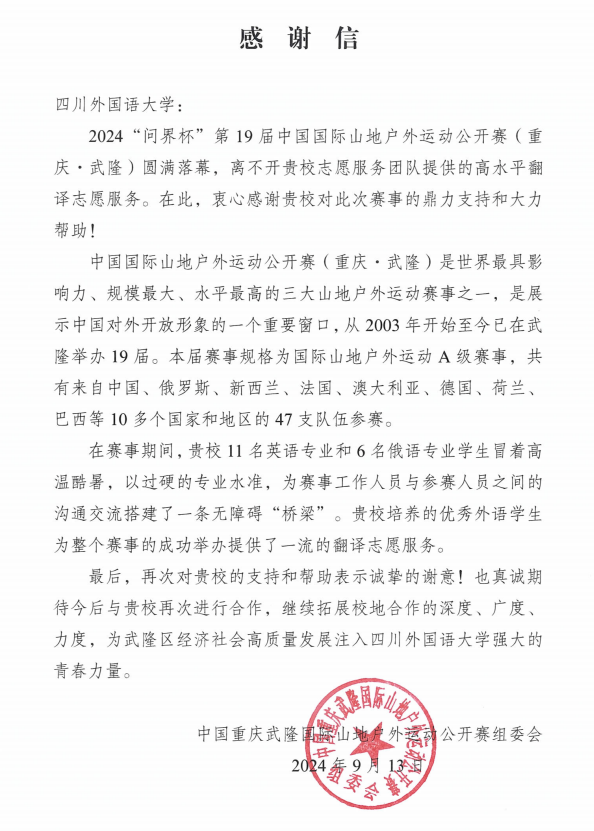 明陞m88官方网站志愿者们在本次第19届中国国际山地户外运动公开赛志愿者服务中兢兢业业,工作态度积极,工作效果良好,也收到了武隆区团委的感谢信,彰显了翻院学子的风采。