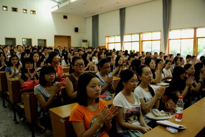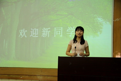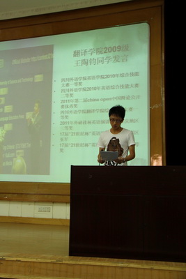 09级员工代表王陶钧以英文致欢迎辞,希望新同学能坚持专业学习,提高翻译技能。来自2012级的新生李佳颖,代表全体新生表达了川外、对明陞m88官方网站的热爱,希望同学们在今后的生活、学习中不断夯实基础,努力提高自身素质。