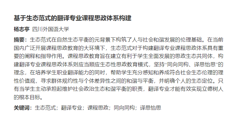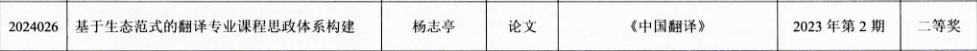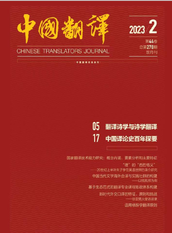 成果简介:《中国翻译》(2023版)复合影响因子:2.79;(2023版)综合影响因子:1.223。该刊被以下数据库收录:CSSCI 中文社会科学引文索引(2021-2022)来源期刊;北京大学《中文核心期刊要目总览》来源期刊。